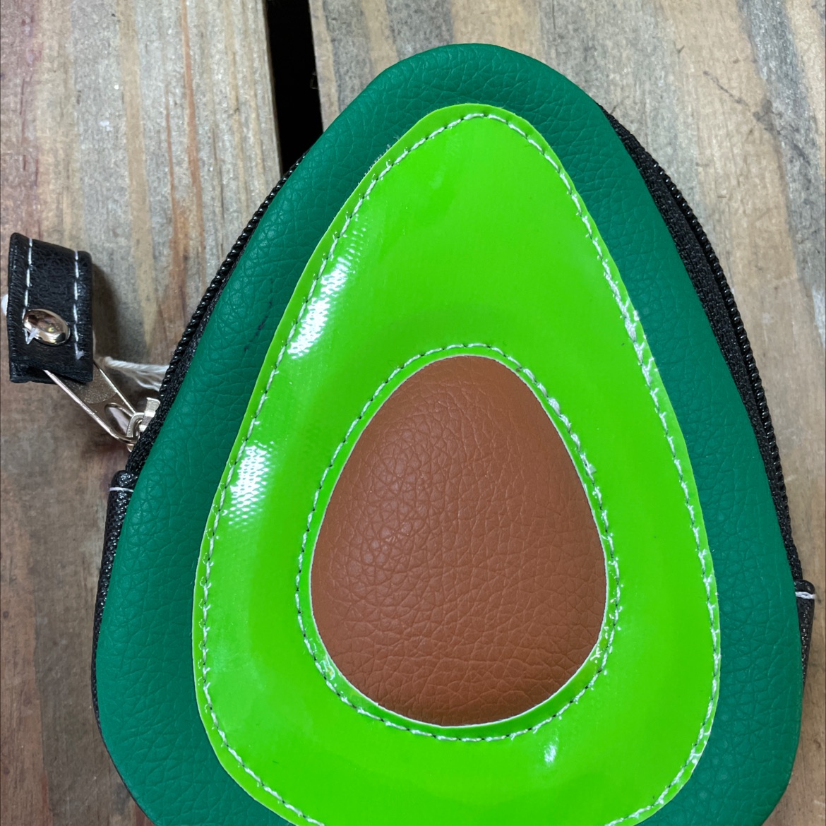 Product Description Adorable avocado coinpurse with top zipper. Measures approximately 5" tall, 4.75 wide and 1" deep.